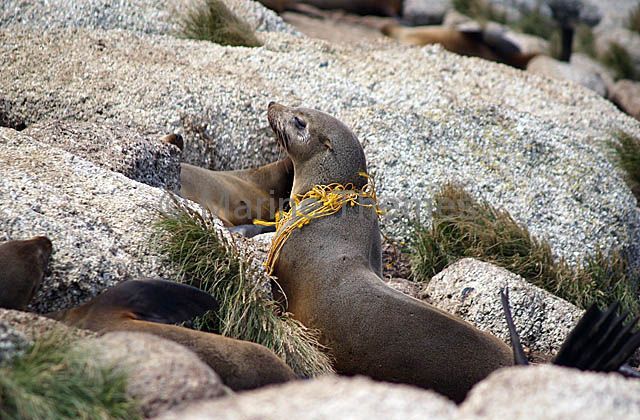 Australian Fur Seal (Arctocephalus pusillus doriferus) with yellow fishing net fragment caught around neck.