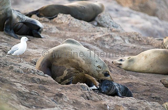 Australian Fur Seal (Arctocephalus pusillus doriferus) removing placenta from newborn.
