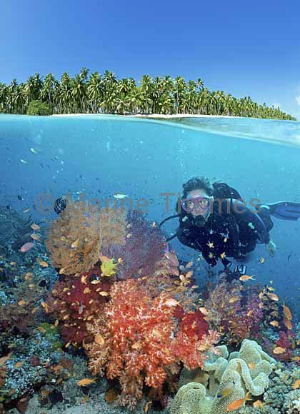 Soft Corals (Dendronephthya sp.) and diver in split shot showing tropical island with coconut trees.
