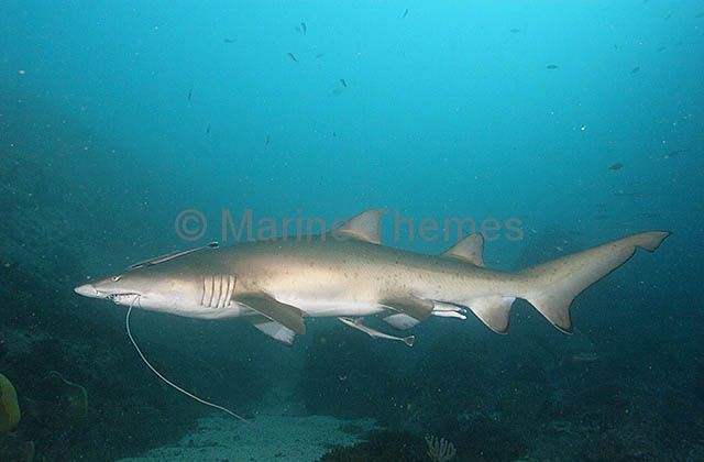 Grey Nurse Shark (Carcharias taurus) Large adult patrolling along rocky reef wall with nylon shark trace protruding from its mouth. single one alone lonely isolated individual danger dangerous killer kill predator predater hunt hunter carnivour carnivor carnivore threat threaten curious curiousity curios curiosity look looking inspect inspecting gaze gazing inquisitive inquiring enquiring interested questioning nosy prying happy smile smiling smiler grin grimace teeth tooth dental fang fangs mouth jaw jaws sharp point pointed canine canines bite biter bit shark sharks elasmobranch elasmobranchs chondricthyan chondricthyans selachii lamniforme lamniformes mackerelshark mackerel odontaspidae odontaspiforme odontaspiformes sand tiger sandtiger vertical Mackerel Sharks |Grey Nurse Shark (Carcharias taurus)