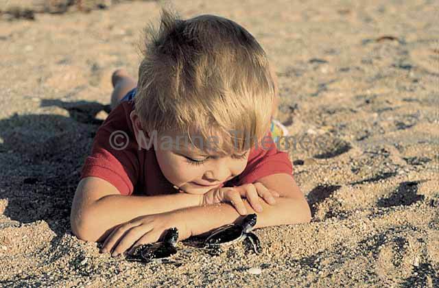 Green Turtle (Chelonia mydas) hatchling with child on beach.