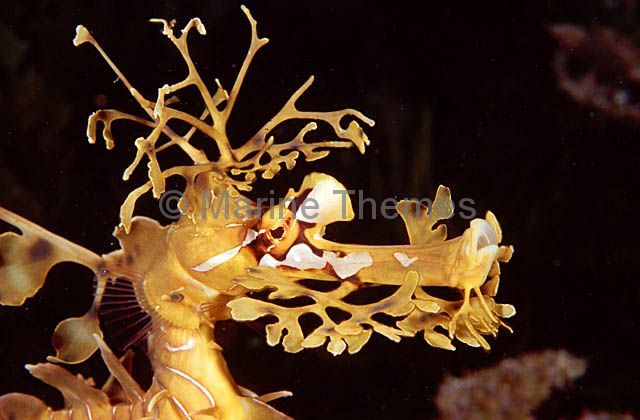 Leafy Sea Dragon (Phycodurus eques) Juvenile. strange bizarre unusual cryptic camouflage single one alone lonely colour color yellow tassel tassels appendages weed portrait mouth open eye look looking peer peek stare crown seadragon Seahorses |Leafy Seadragon (Phycodurus eques)