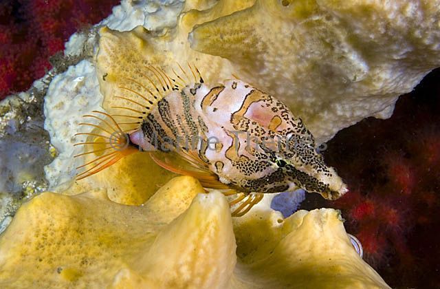 Grunt Sculpin (Rhamphocottus richarsoni) propped on sponge. Cottidae (Sculpins) Scorpaeniformes (scorpionfishes) single one alone lonely isolated individual camouflage camoflage camouflaged camoflaged hidden hiding hide cryptic line lines lined stripe stripes striped patterns pattern band bands banded strange unusual weird bizarre bizzare bizzarre ugly freak freaky cute friend friendly cuddly cuddle play playful happy smile smiling small tiny minute minuet miniscule diminutive macro micro little minor minature miniature petite puny |Grunt Sculpin (Rhamphocottus richarsoni)