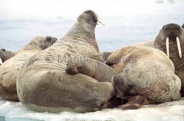 Atlantic Walrus (Odobenus rosmarus rosmarus) Mother and pup. Atlantic Walrus (Odobenus rosmarus rosmarus) Mother and pup. family group many crowded asleep resting ice floe iceflow iceberg iceburg care protection young newborn baby maternal parents tusks Seals |Atlantic Walrus (Odobenus rosmarus rosmarus)